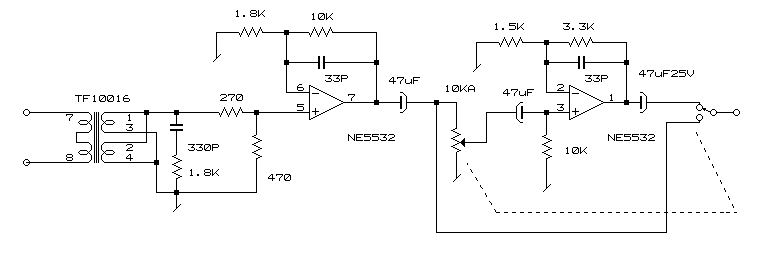 後段非反転増幅です。トランスの出力を分圧している抵抗値はOPアンプの増幅度決定の抵抗値と非常に面白い