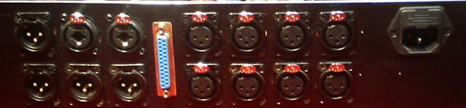 裏パネルは電源と1-8のXLRとD-subそして7-8の追加コネクターとダイレクトアウトのXLRです。